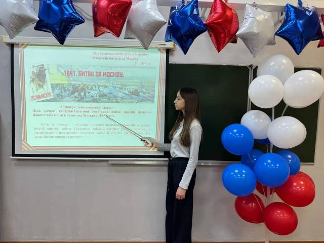 % декабря в школе прошел урок памяти, посвященный дню воинской славы России: контрнаступлению советских войск под Москвой. Советник по воспитанию рассказала о тяжелом положении на фронтах к зиме 1941/1942 гг. Ребята подготовили страницы, где поведали о подвиге Зои Космодемьянской, других защитниках столицы. Урок оставил глубокий след в сердцах учеников.