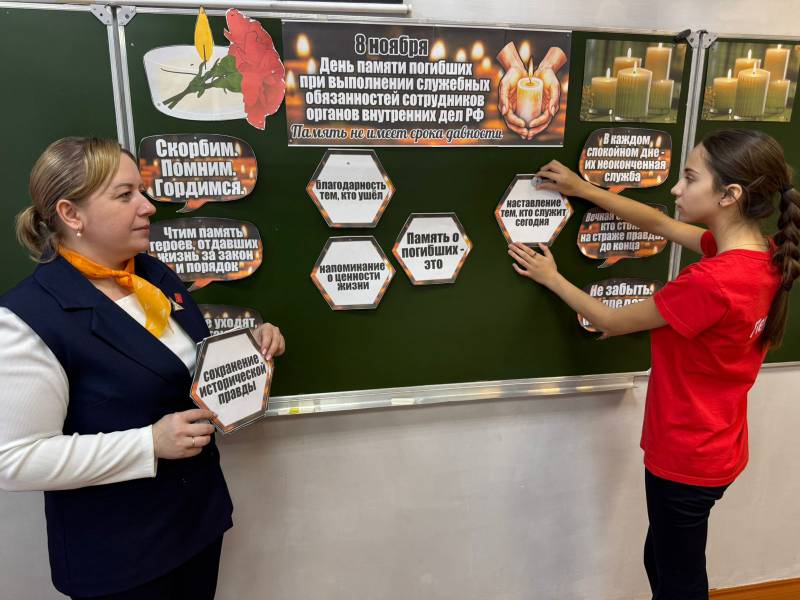 8 ноября - День памяти сотрудников МВД, погибших при исполнении служебных обязанностей. В преддверии этого дня в школе прошел урок мужества "Подвиг во имя жизни". В ходе мероприятия советник директора по воспитанию Шмакова В.И. рассказала о трудной и опасной работе сотрудников полиции, об их неравнодушии и готовности защищать общество. ребята почтили память погибших сотрудников минутой молчания.
